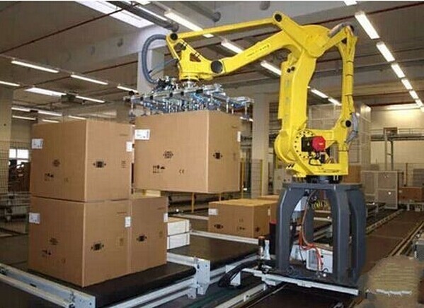 Robot palletizer for carton box covers small floor space, of large production capacity, fully automatic working. It could handle different boxes. And when there is some change about the production line, just need to modify the software program.